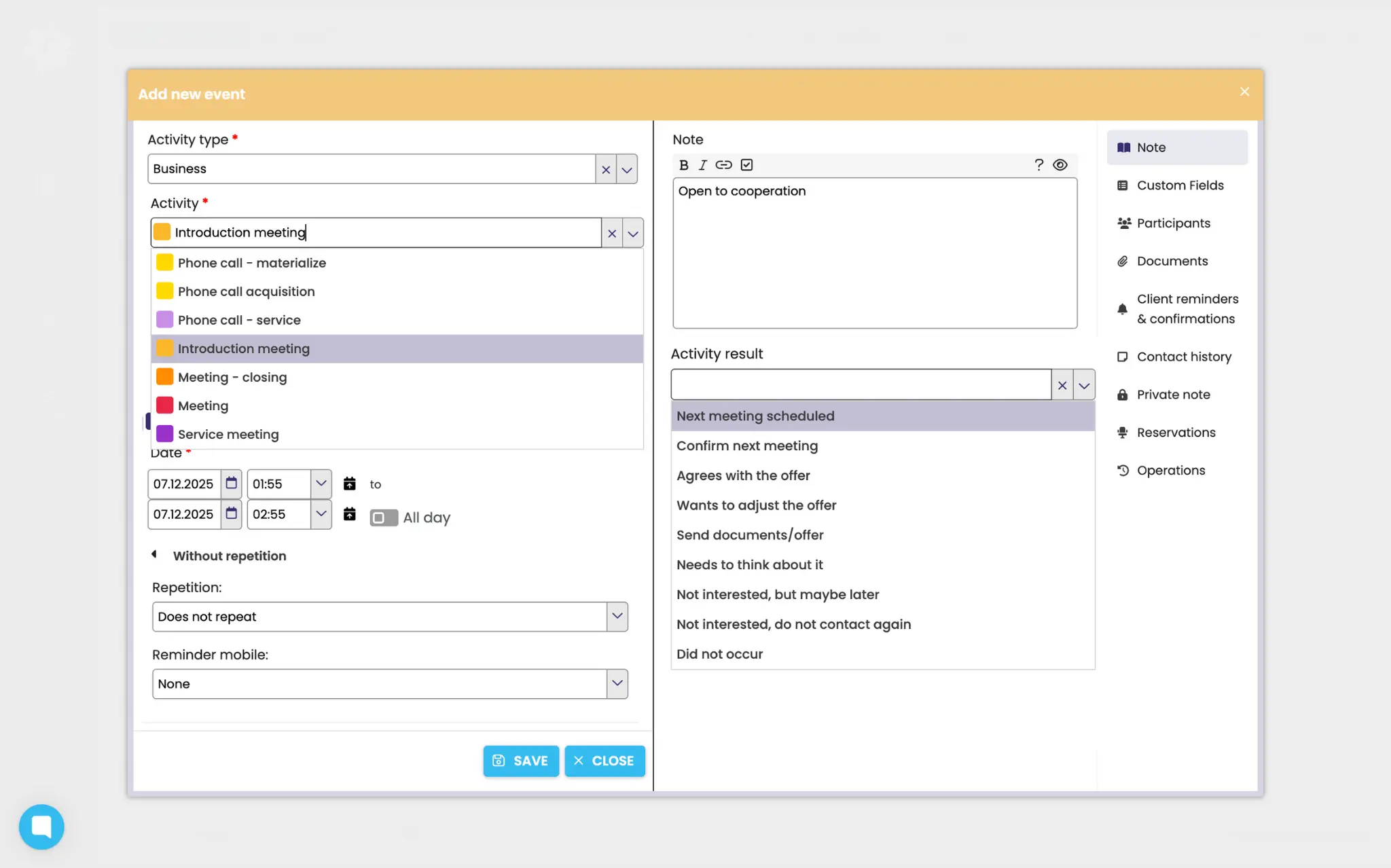 You have a clear overview of the work and results, whether yours or, for example, the salespeople in your team. You get an overview not only in the calendar, but also in the client’s card among the history of client activities.