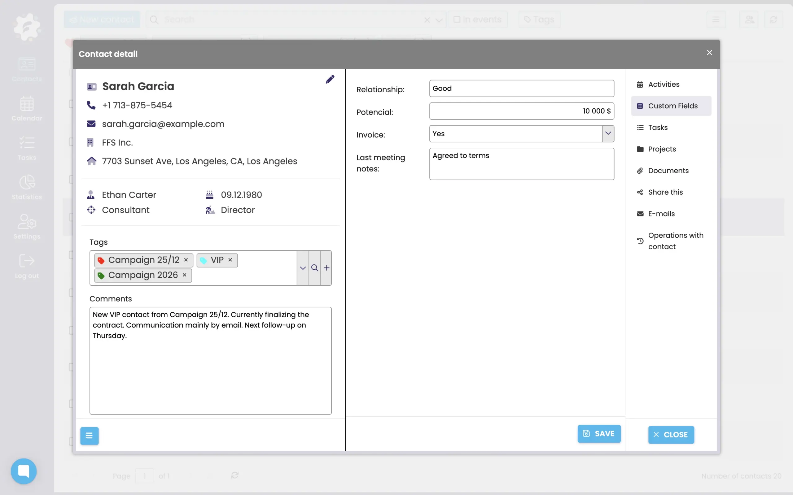 You can keep track of the preferred method of contact, the number of contracts, the potential estimate, or the frequency of communication. Thanks to the different types of fields, you have complete freedom over what you save to the contact.